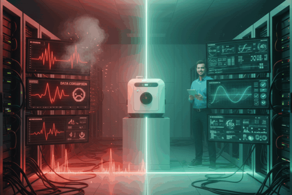 O gerador é a primeira linha de defesa contra a deterioração de ativos. Além de evitar o apagão total, ele protege seus equipamentos eletrônicos, servidores e sistemas críticos contra as frequentes oscilações, picos e quedas de tensão que ocorrem na rede pública.